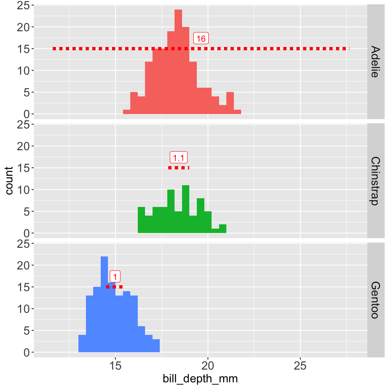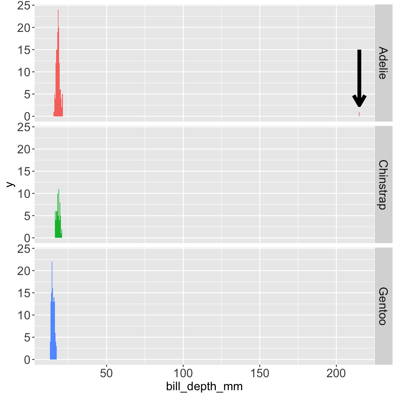 With this chunk of code I’ve added an outlier at in the variable bill_depth_mm at 215 mm. Let’s see what happens.